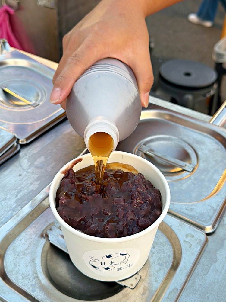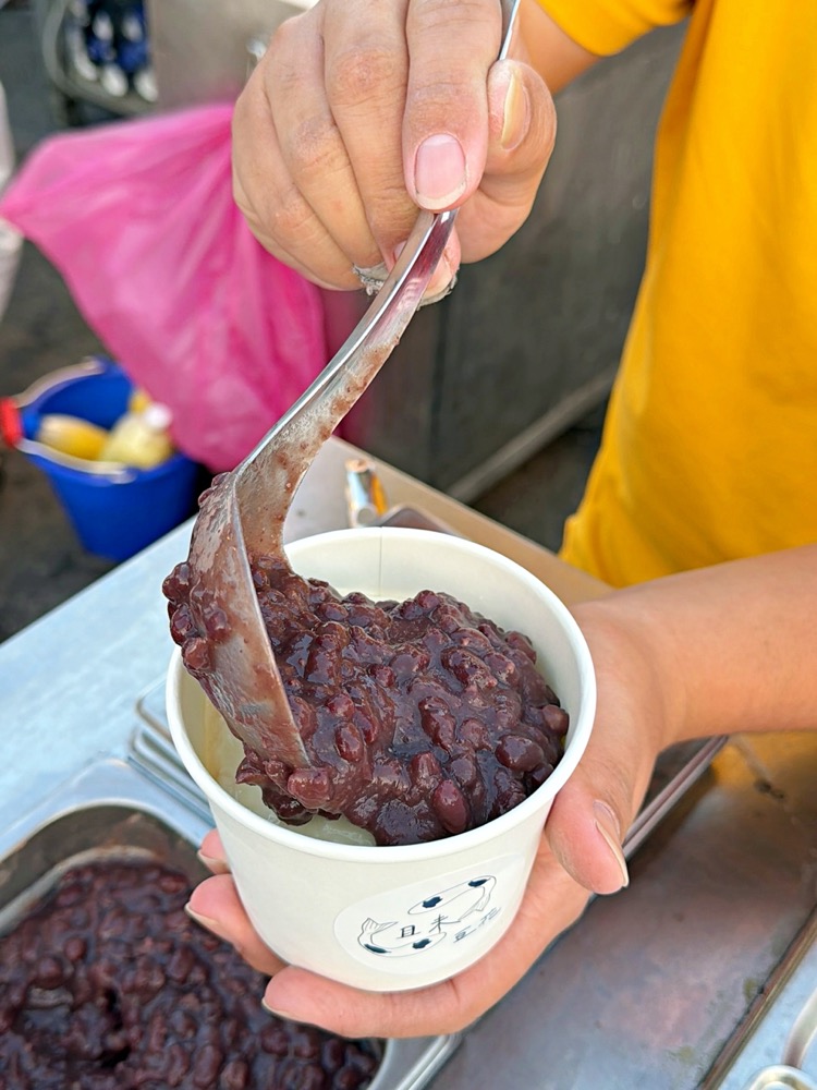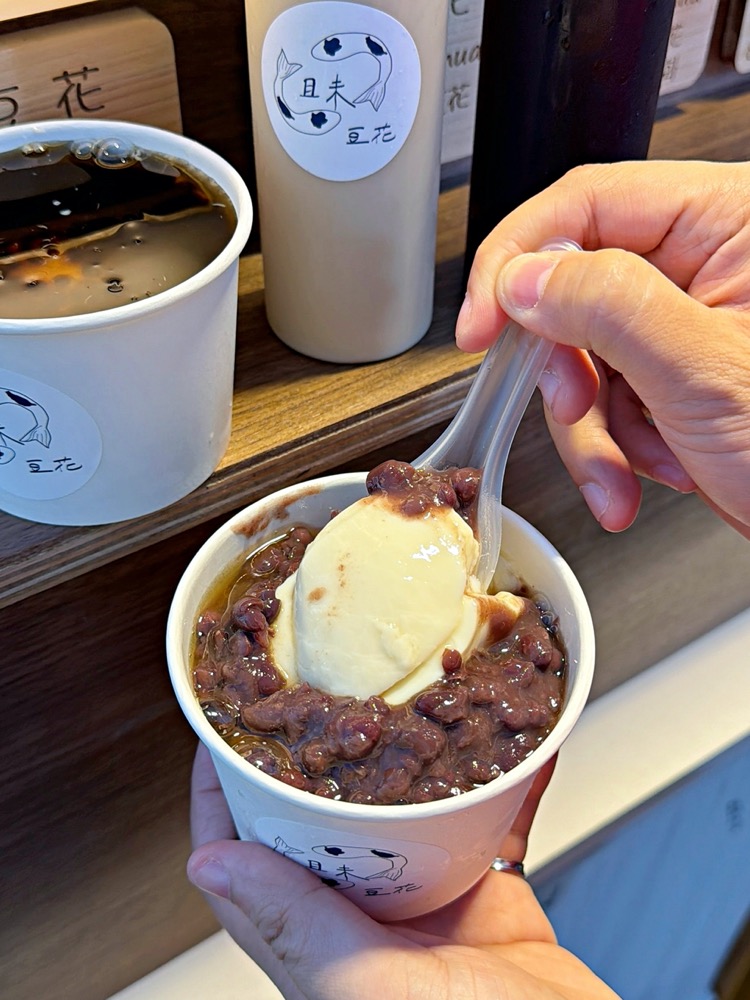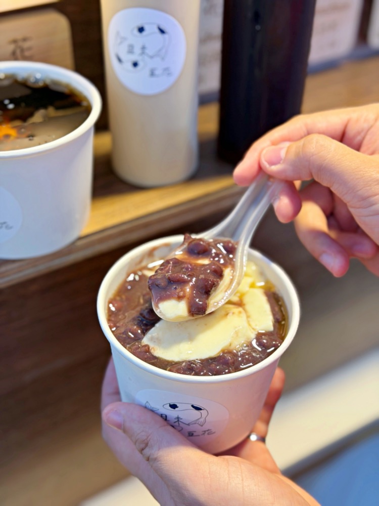 口感綿密細緻的豆花,豆香非常平衡,搭配糖水與綿密紅豆,口感清爽會讓人想一口接著一口呀!