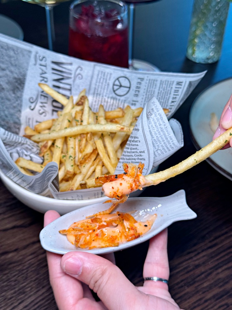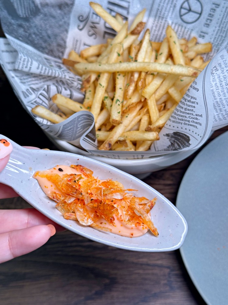 上頭是低溫烘烤的東港櫻花蝦搭配美乃滋,與酥脆鹹香的薯條做了完美搭配,吃起來海味十足!