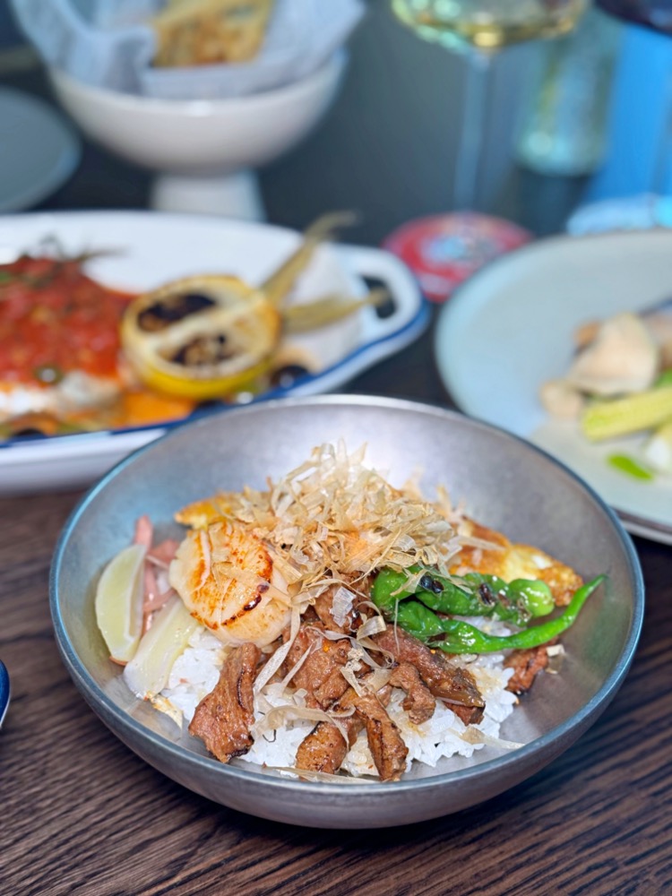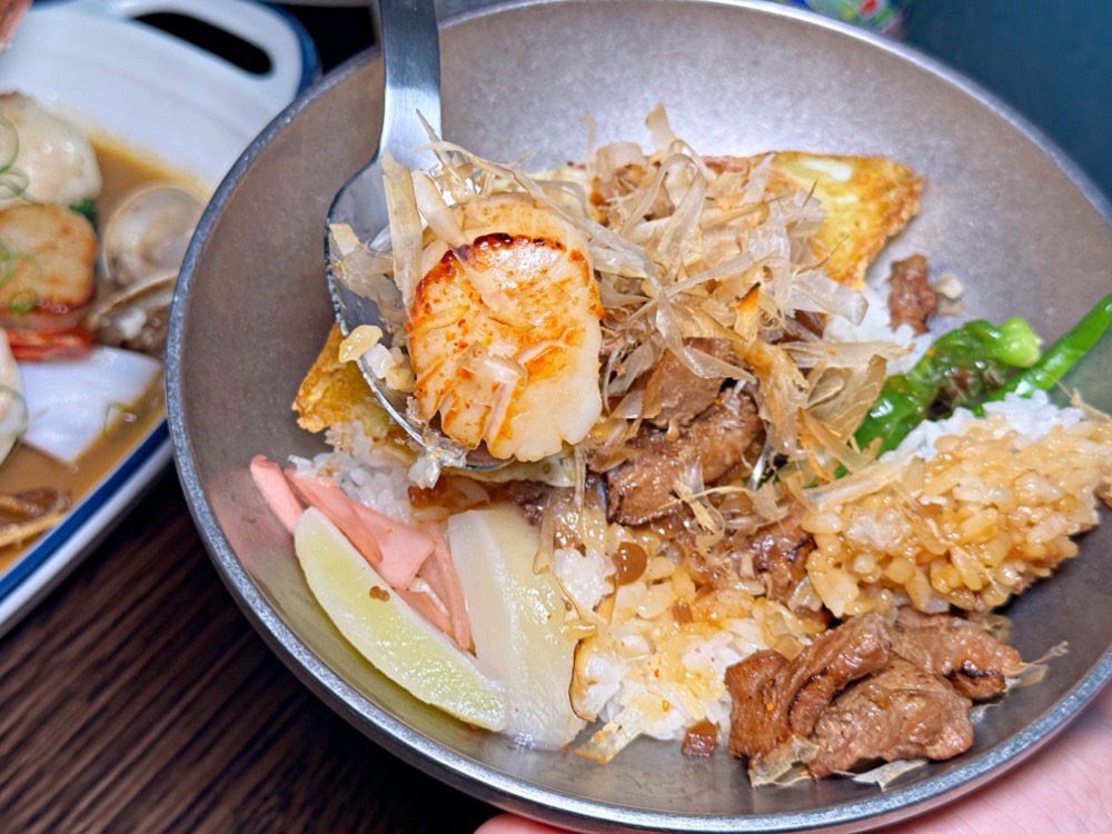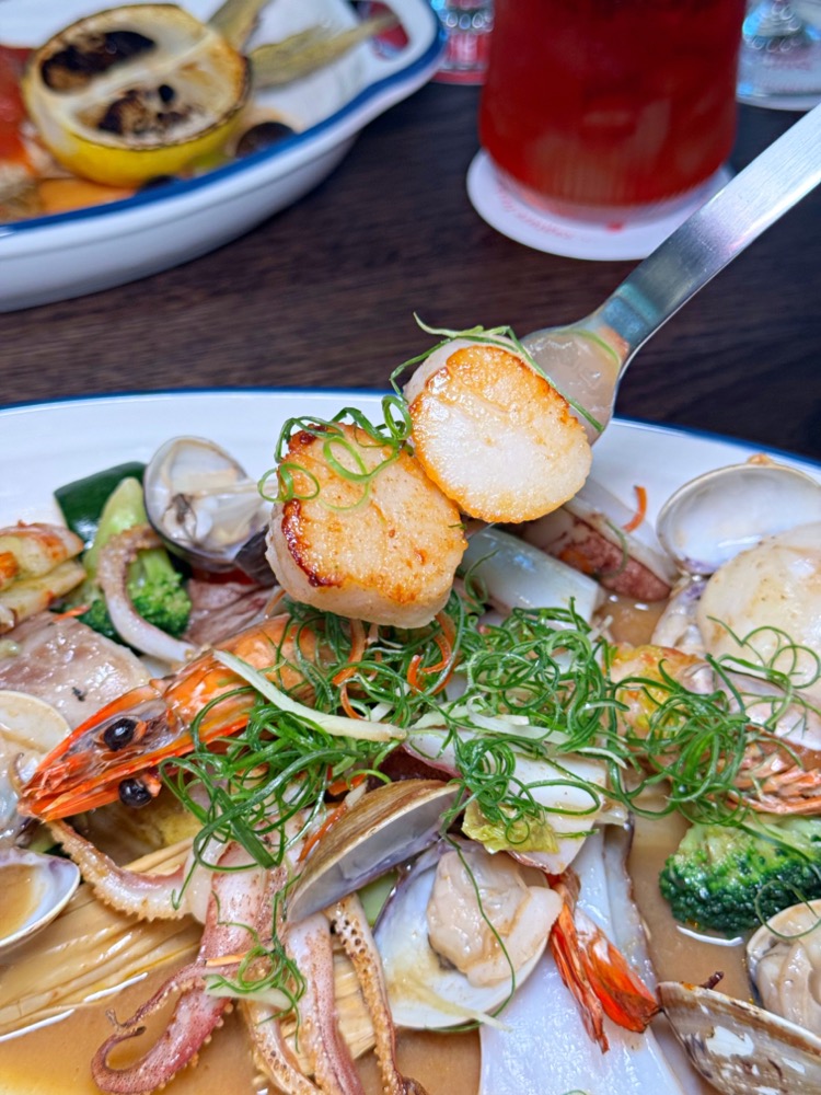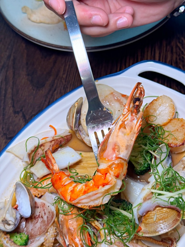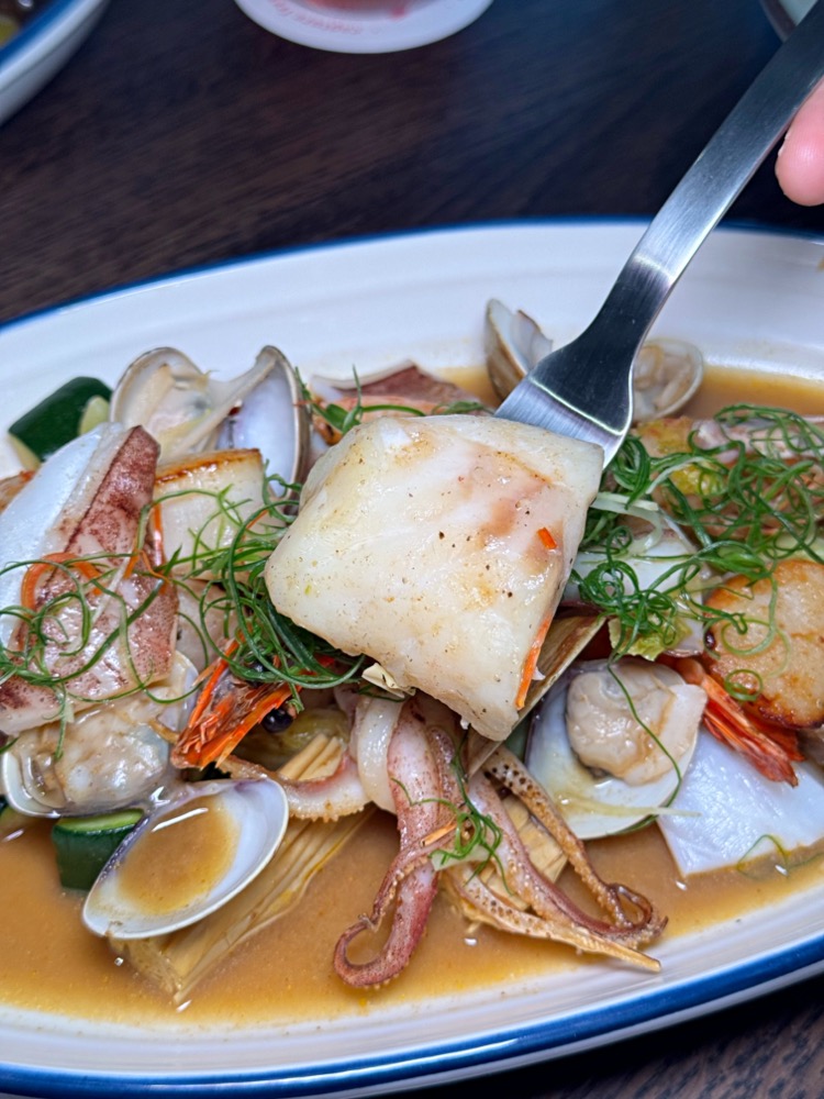 有龍虎石斑、中卷、草蝦、蛤蠣、干貝,主廚說因為台灣人愛吃鍋,所以將沙茶鍋的沙茶與叻沙做結合當做基底