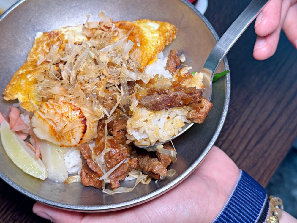 黑鮪魚吃起來軟嫩又入味,與軟硬適中的白米飯吃起來鹹香涮嘴,一定要搭配一顆煎蛋,半流心吃起來更過癮