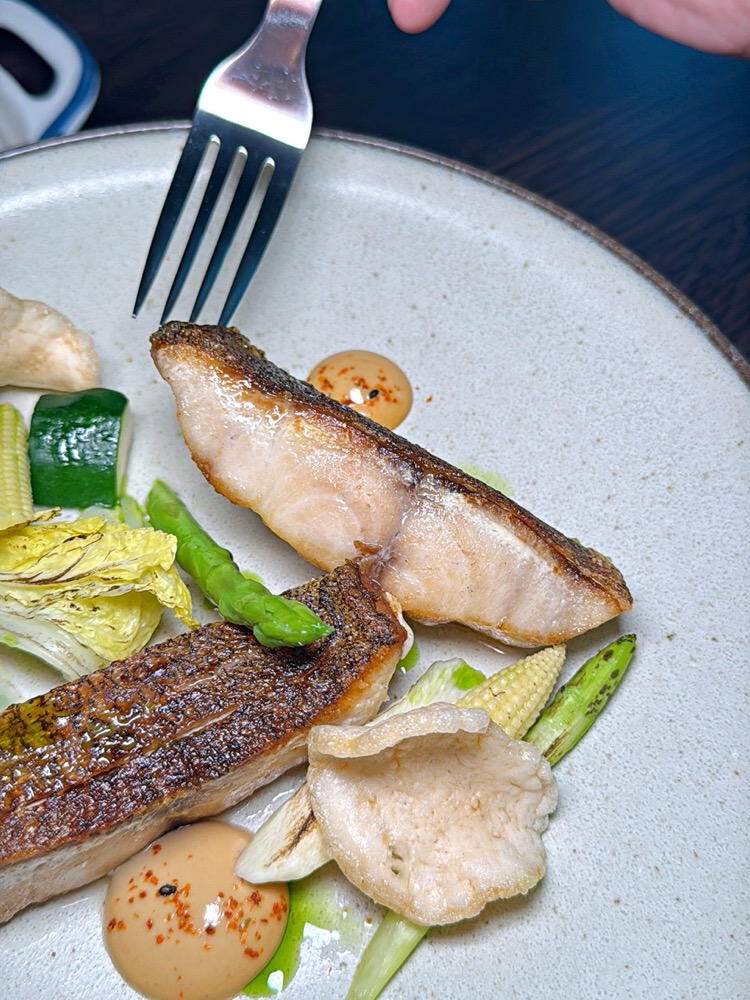 海鱺肉質細嫩,油脂與魚肉黃金比例呈現,推薦搭配一旁的赤味噌口感更上一層樓喔!