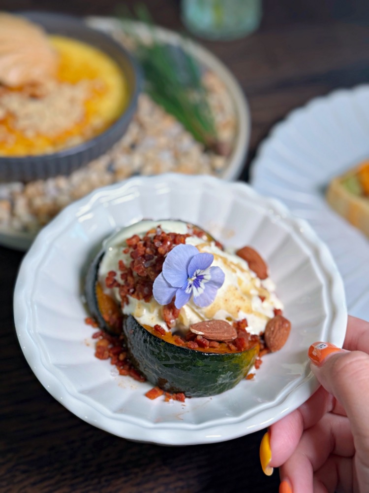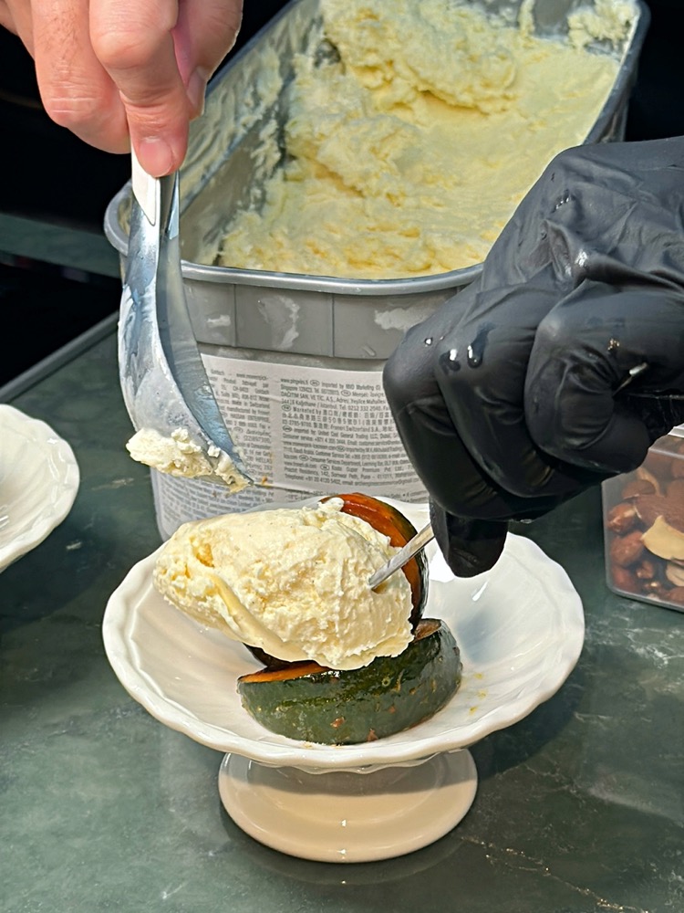 撒上鹹焦糖培根、淋上榛果奶油,鹹焦糖培根與冰淇淋、南瓜超級搭欸,吃起來鹹香鹹香越吃越涮嘴~
