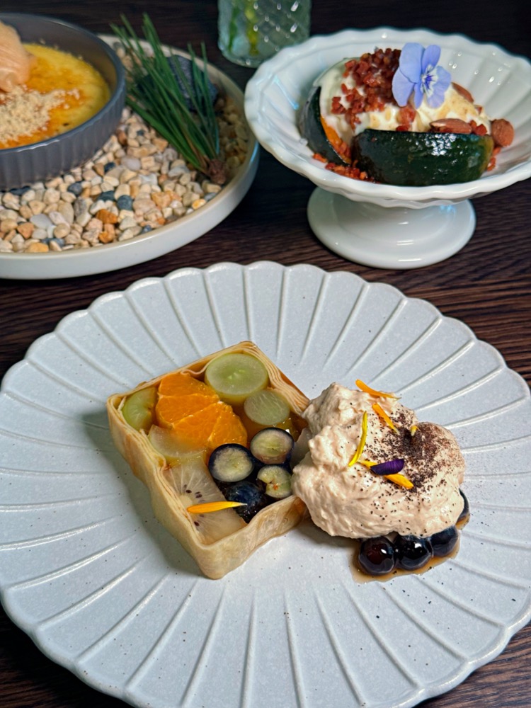 法式千層中間有多種水果,一旁擠上茶慕絲與珍珠,呼應鹽埕區奶茶一條街~