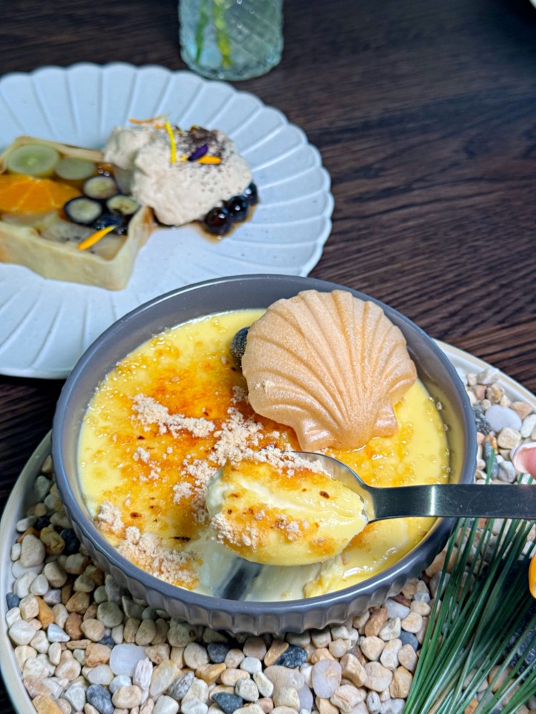 布蕾上先灑上糖粉再經過炙燒,接著擺上有金粉的藍莓,放上貝殼造型的最中餅!