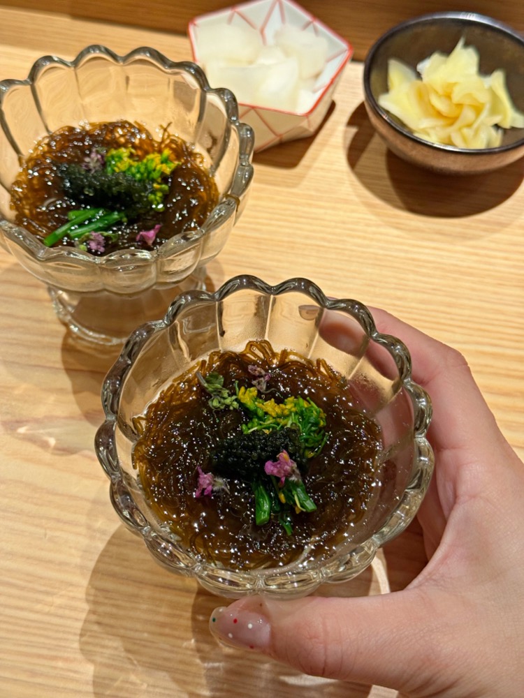裡頭是油菜花與海葡萄,吃起來古溜古溜直接滑入口中,微酸微甜很開胃!