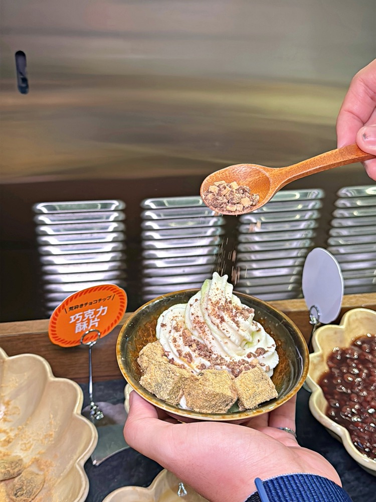 還可以自己自由添加配料,有紅豆、日式蕨餅、黑糖珍珠、巧克力酥片等等超豐富