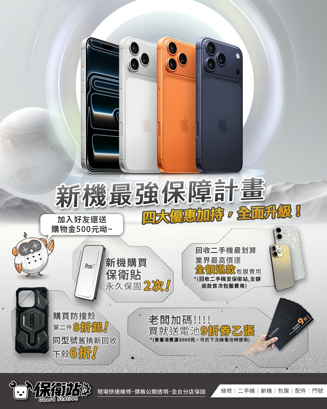 最近iPhone 17系列剛上市,現場蠻多人來取新機,保衛站可以收購舊機直接幫您換新機,順便幫新機搭配周邊,手機殼、手機掛繩、手機貼膜等等相當豐富,買新機+手機殼周邊,一站到位!