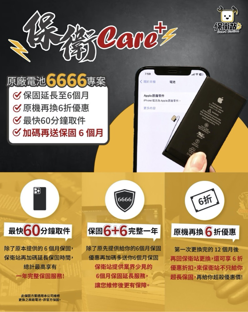 今年首創更換原廠電池就可享有12個月保固!一家維修全台20多家門市門市同步保固!
