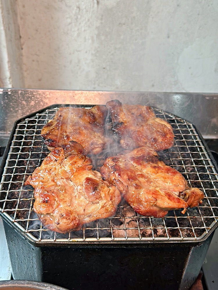 雞腿會先使用蒸烤爐烤過後再在炭火上烤過,香氣更上一層樓喔!