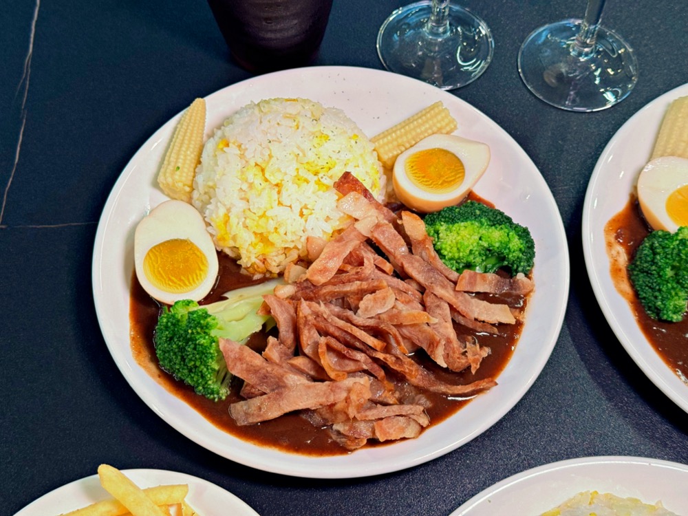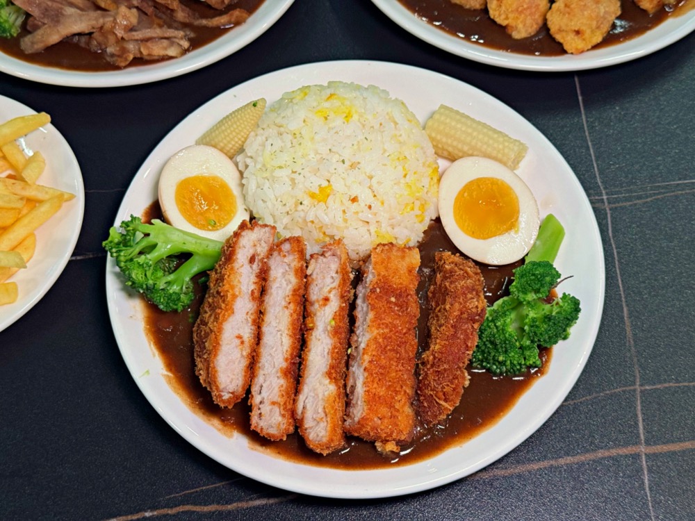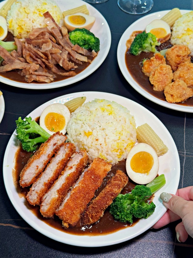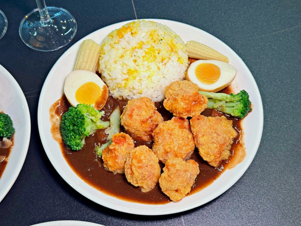這兒主要販售咖哩飯,價位落在$240-$350之間,餐點配菜有玉米筍、時蔬、溏心蛋,而且都有附微糖去冰紅茶一杯喔!