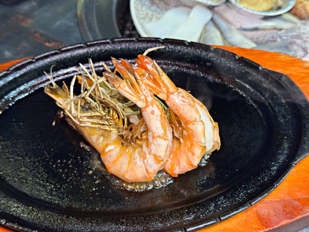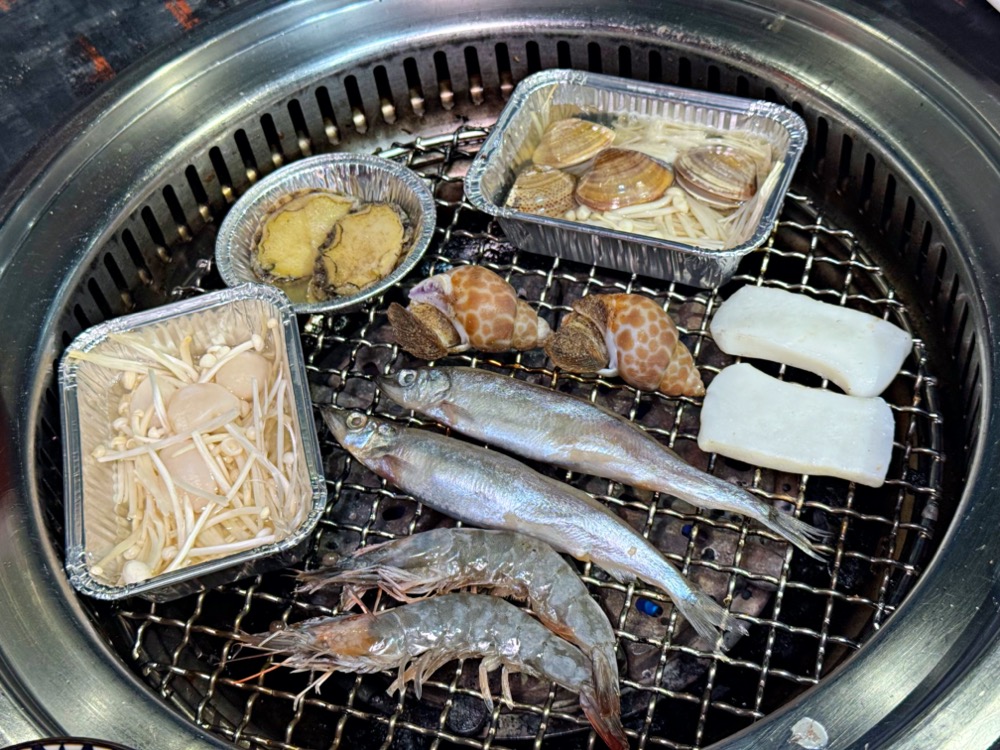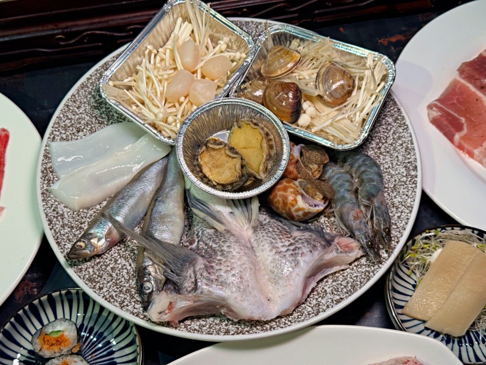 海鮮有白蝦、花枝、柳葉魚、蛤蜊、椒鹽鳳螺、小干貝、魚下巴、鮑魚