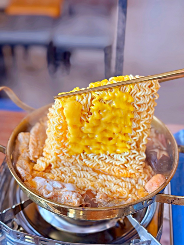 裡頭的韓式泡麵搭配融化的起司實在太銷魂,裡頭還有德式香腸、豬肉等等