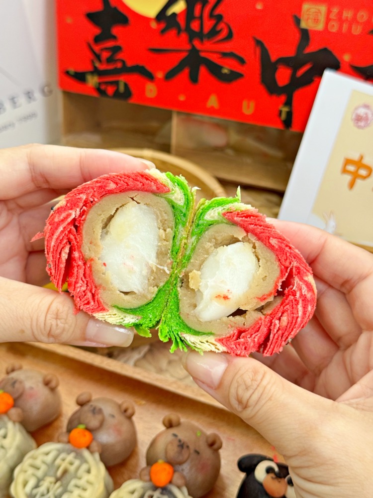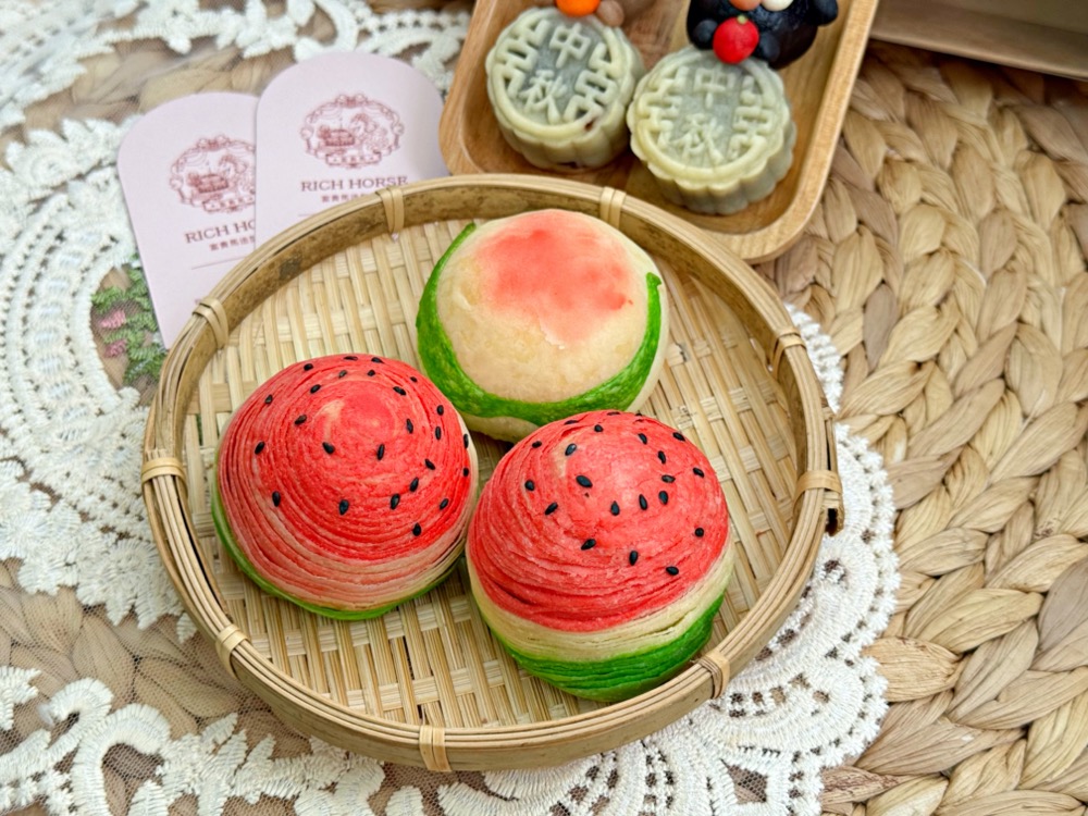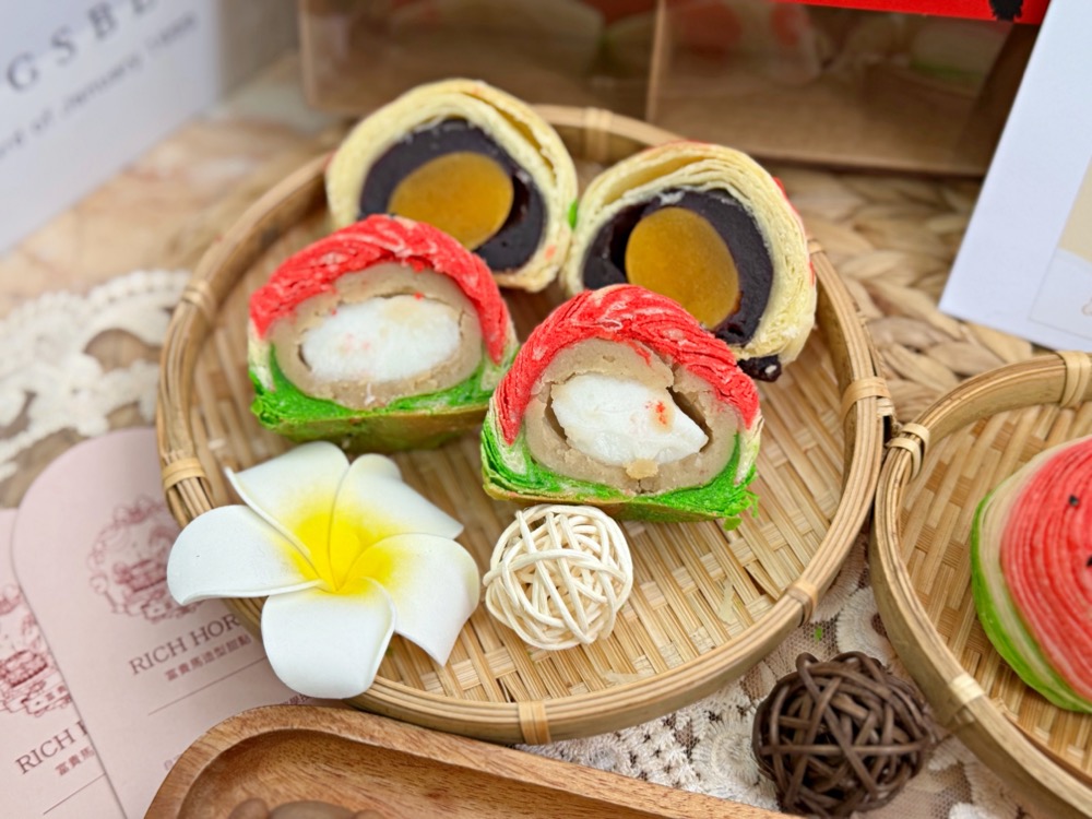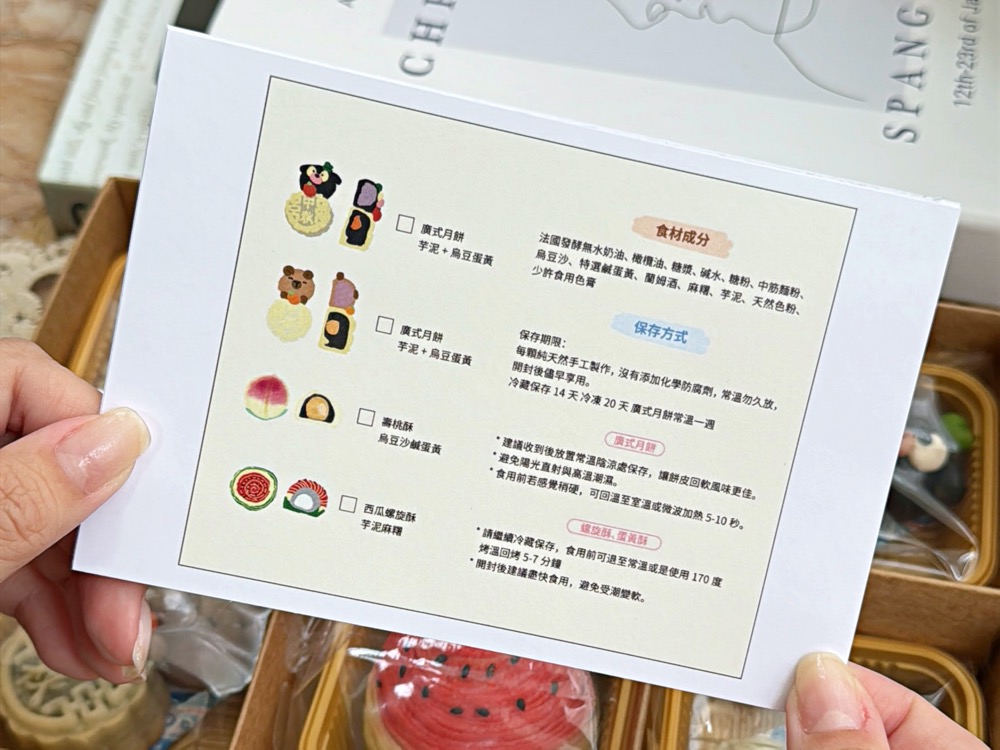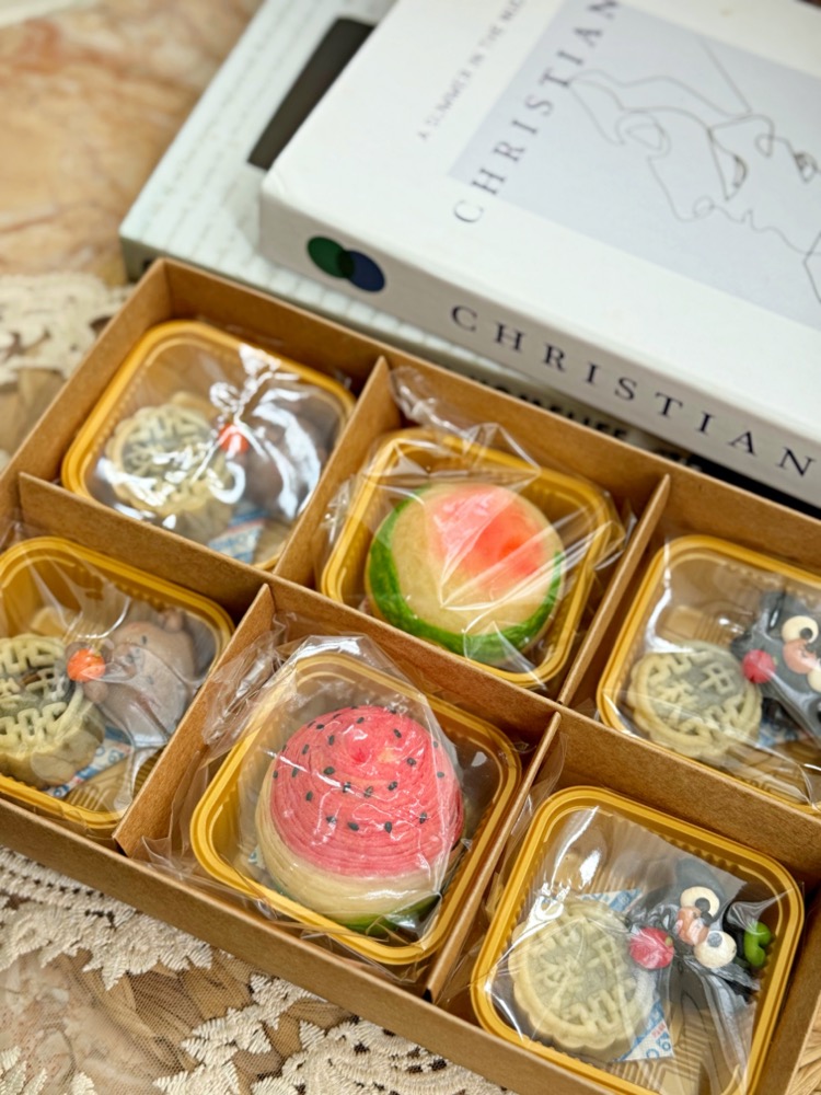 禮盒內容有廣式月餅、西瓜螺旋酥、壽桃蛋黃酥,上頭的圖案也是老闆娘他們自己手繪的喔~