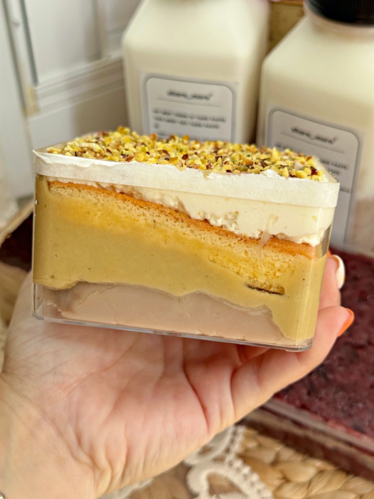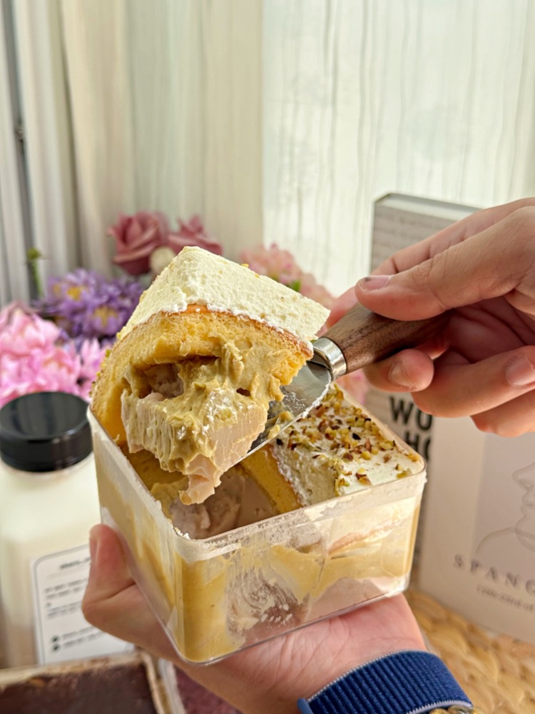 一口吃下可以感受到細緻的奶油口感,接著是軟綿不軟爛的海綿蛋糕,再來就是濃郁的開心果醬與綿密芋泥,甜度非常剛好!!!吃光一盒也不罪惡的那種~