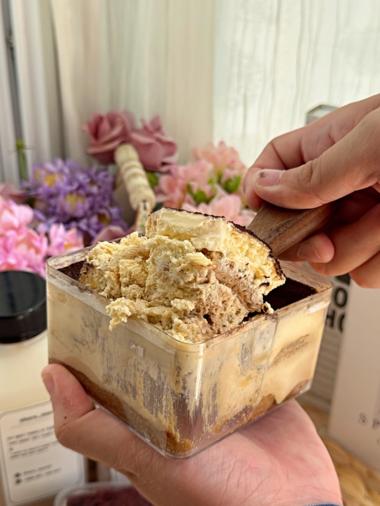 入口即化的馬斯卡彭,吃起來不會油膩感!整體吃起來甜度我覺得不會太高,無糖可可粉帶點苦甜,屬於大人系口味的提拉米蘇