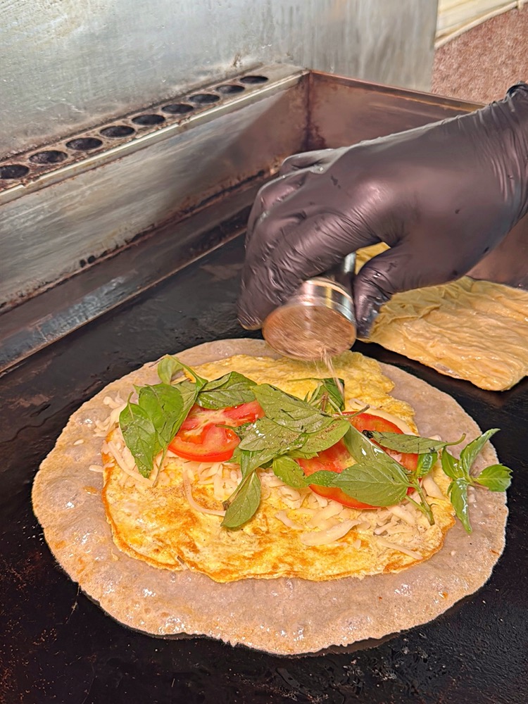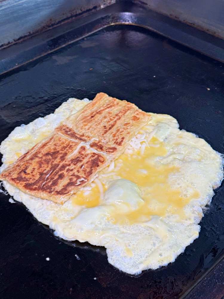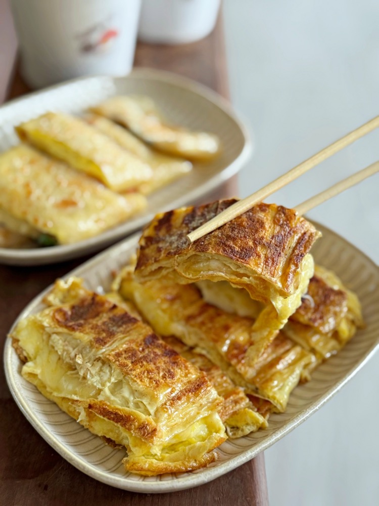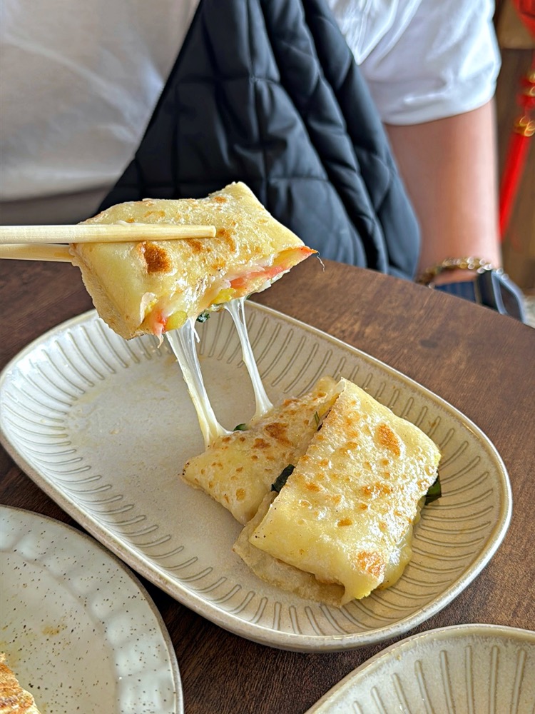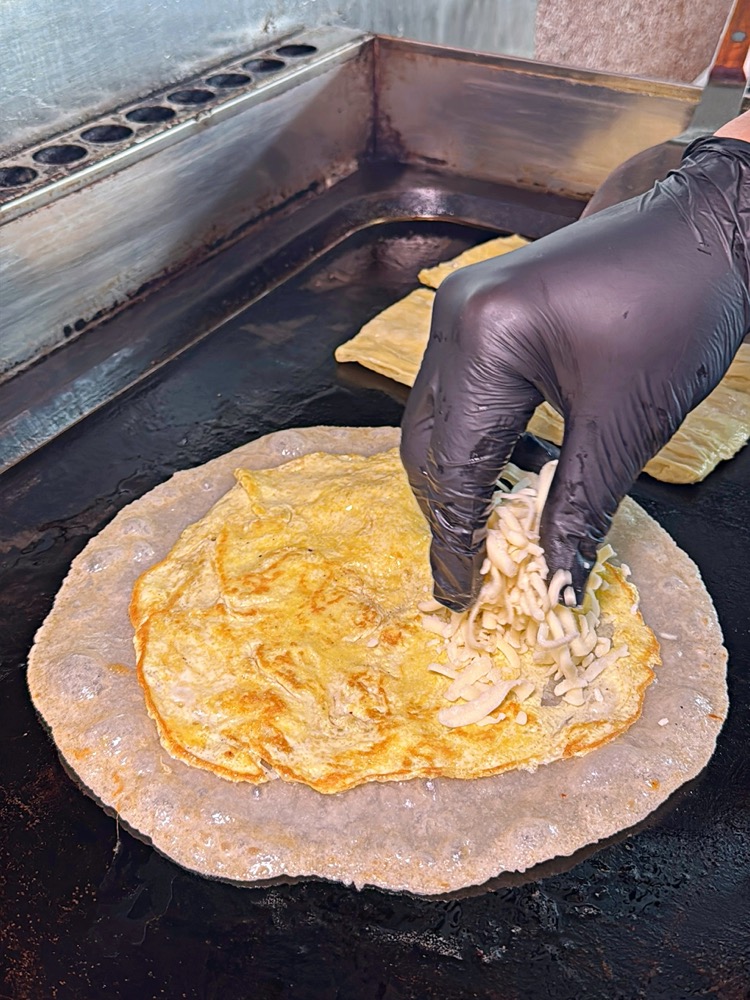 使用豆皮取代蛋餅皮,裡頭打了兩顆蛋份量十足!